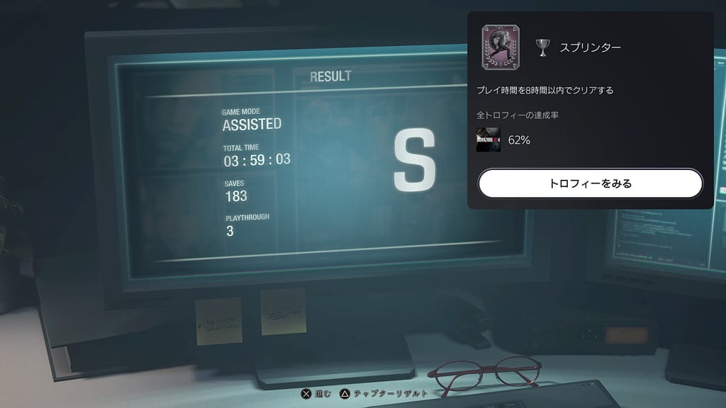 8時間以内にクリアしたので、ついでに『スプリンター』というシルバートロフィーもゲットしたぞ!