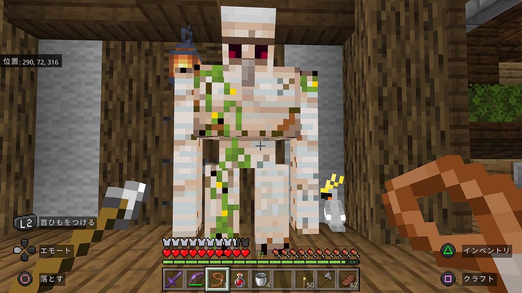 治癒のスプラッシュポーションを手に持ち、傷付いたアイアンゴーレムにL2を投げると瞬時に傷が癒えて回復させることができるぞ!