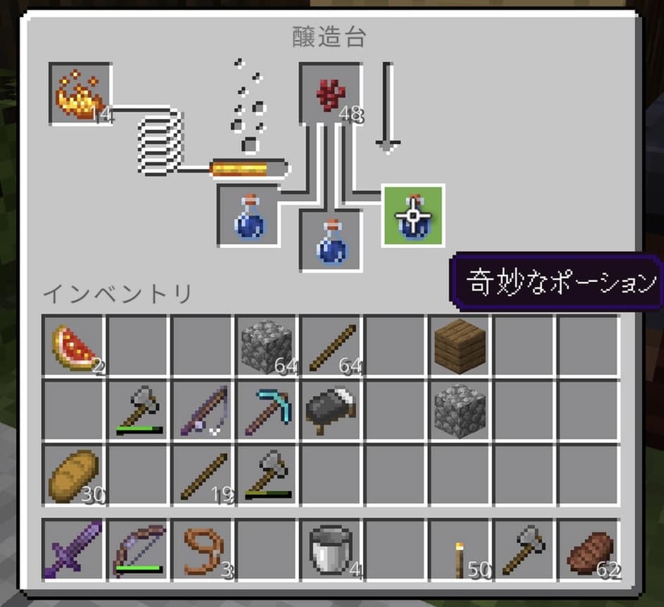 まずは醸造台に水入り瓶とネザーウォートを設置して、『奇妙なポーション』を作る。