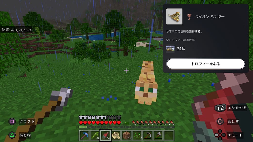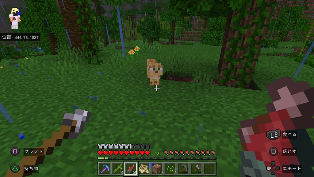 このヤマネコってのはかなり初期の段階で実装されている友好的な生物で、ジャングルバイオームにのみ出現する。