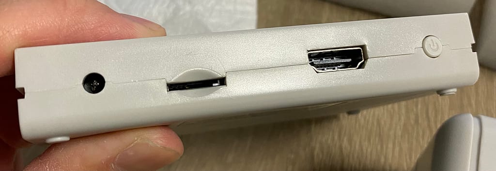 側面表にはUSBポートが2つ、裏にはmicroSDカードのソケットと電源ボタン、そしてよく分からん穴がある。
