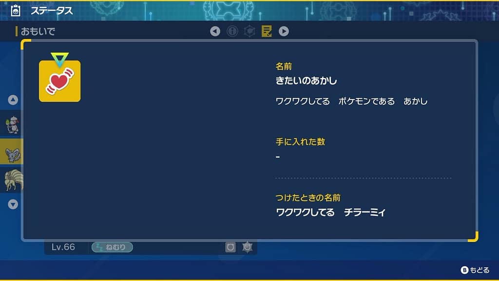 『おもいで』の項目で、右下に『つけたときの名前』と記載があると二つ名が付いてるってことだ!