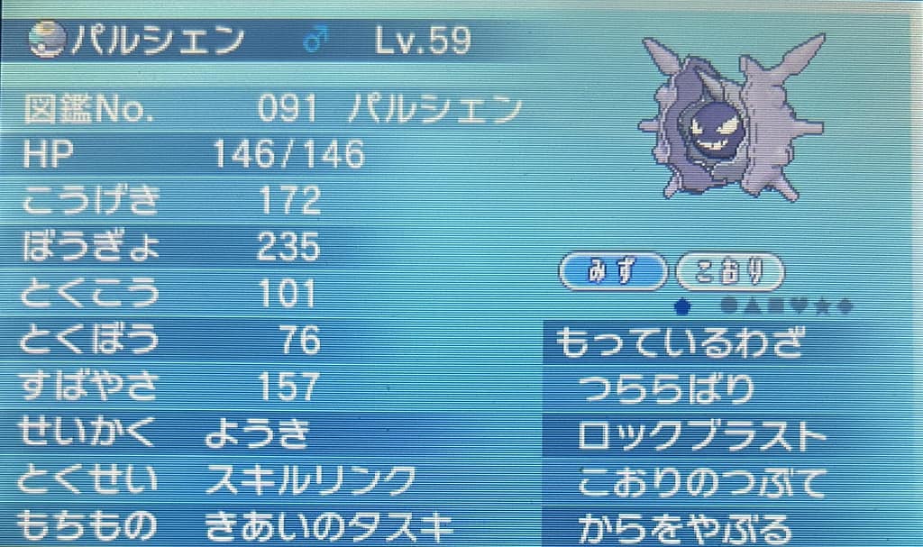 そして、50連戦目のバトルシャトレーヌでのみ使用するパルシェン。第五世代で習得した『からをやぶる』と特性『スキルリンク』の組み合わせが鬼強い。